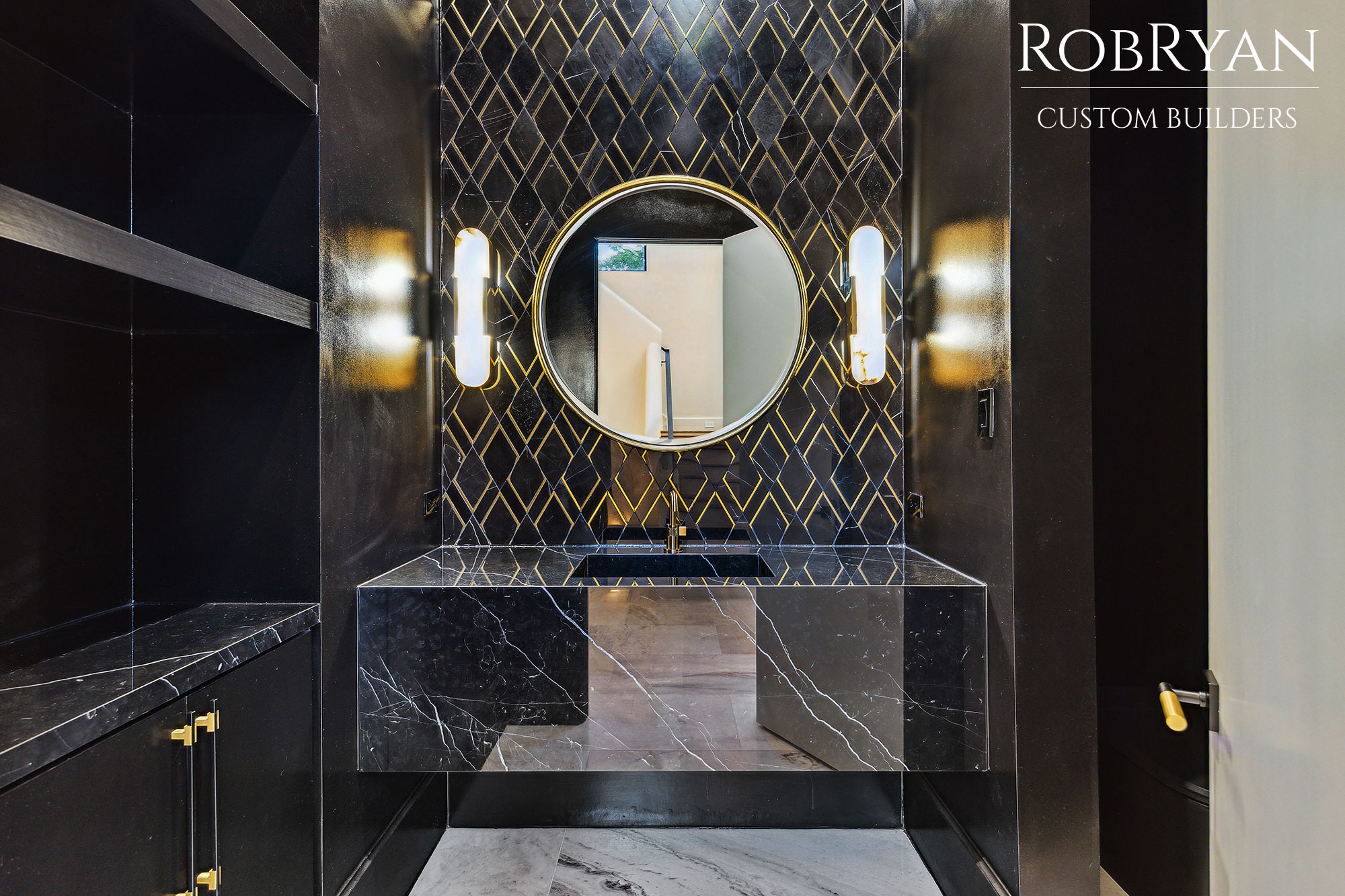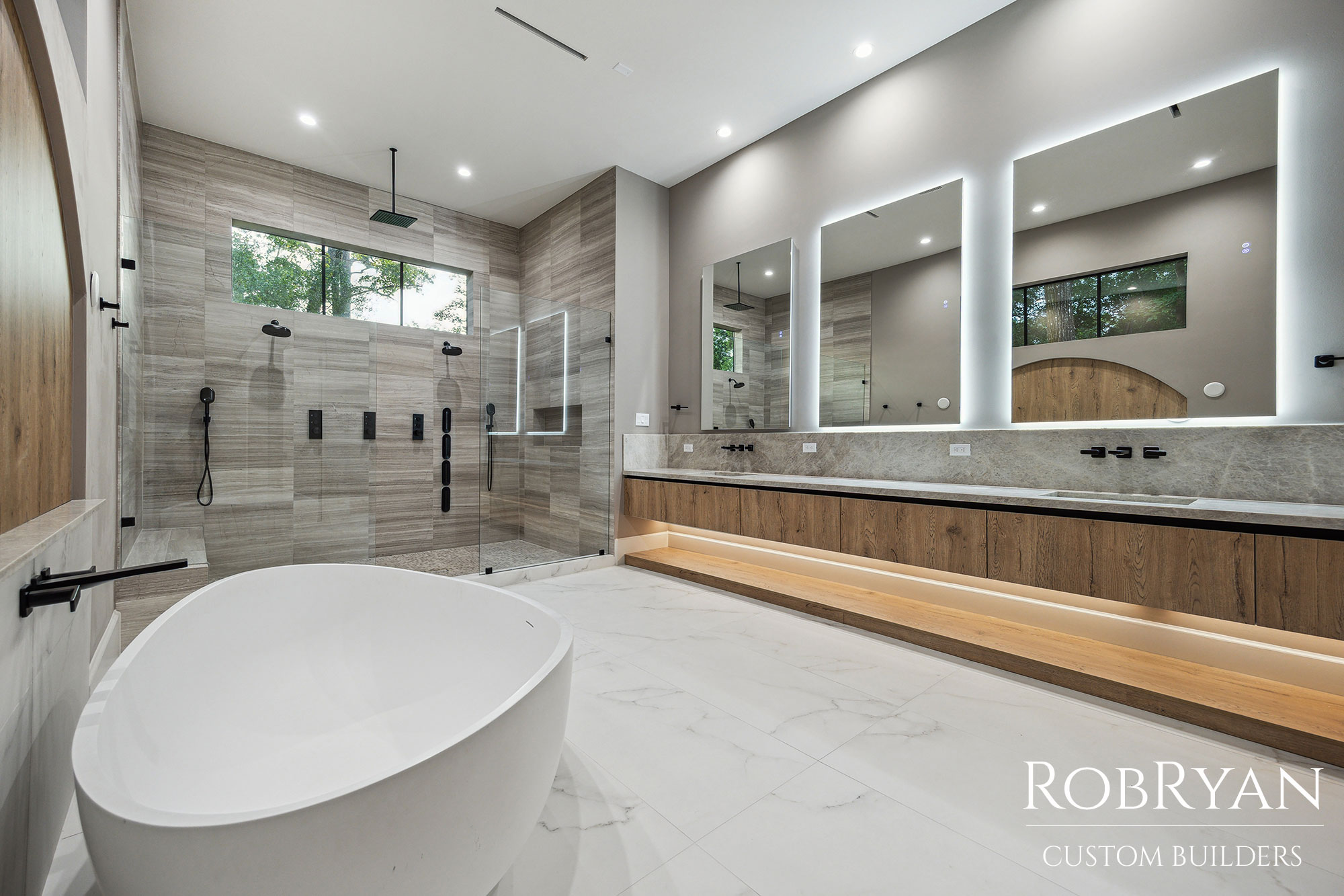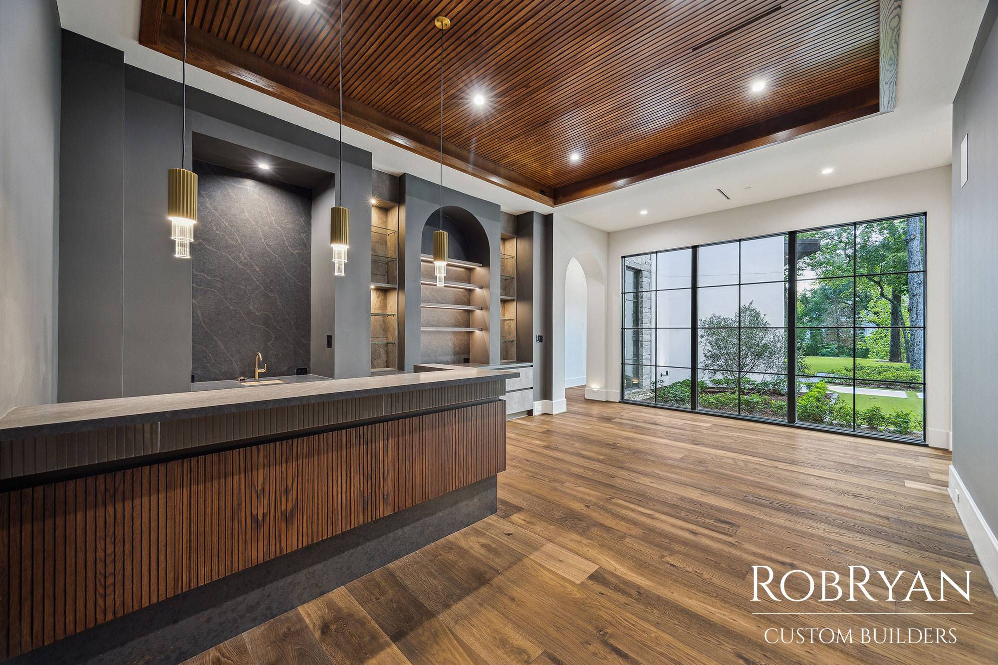 The Friar Tuck Residence by RobRyan Custom Builders is a stunning showcase of modern luxury and timeless craftsmanship. Inside, rich wood, stone, and gold accents define elegant spaces like the custom bar, striking powder room, and spa-inspired primary bath with a sculptural tub and dual rain showers.